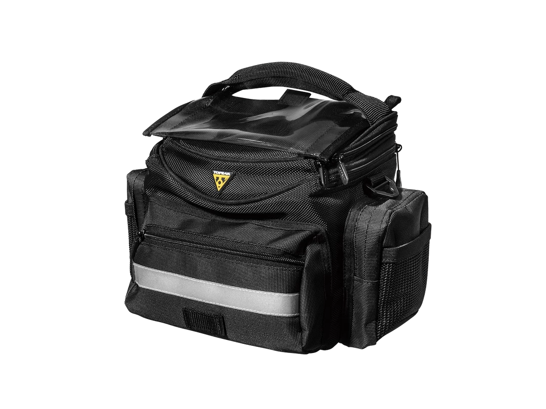 The Topeak Tourguide is a full featured, medium capacity handlebar bag with a handy Quick-Click mount and shoulder strap that makes it easy to take it with you on the go. The fully padded main compartment is divided, with two front zips and two separate side pockets to keep your gear organized, there is even a clear map pocket at the top. A safety light clip, reflective light strip and rain cover are all included. Perfect for extended touring, day trips and commuting.