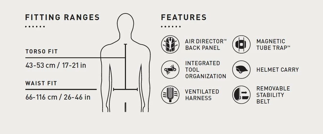 - Removeable Stability Belt: For additional fit and stability. Ventilated Harness: Lightweight and breathable.