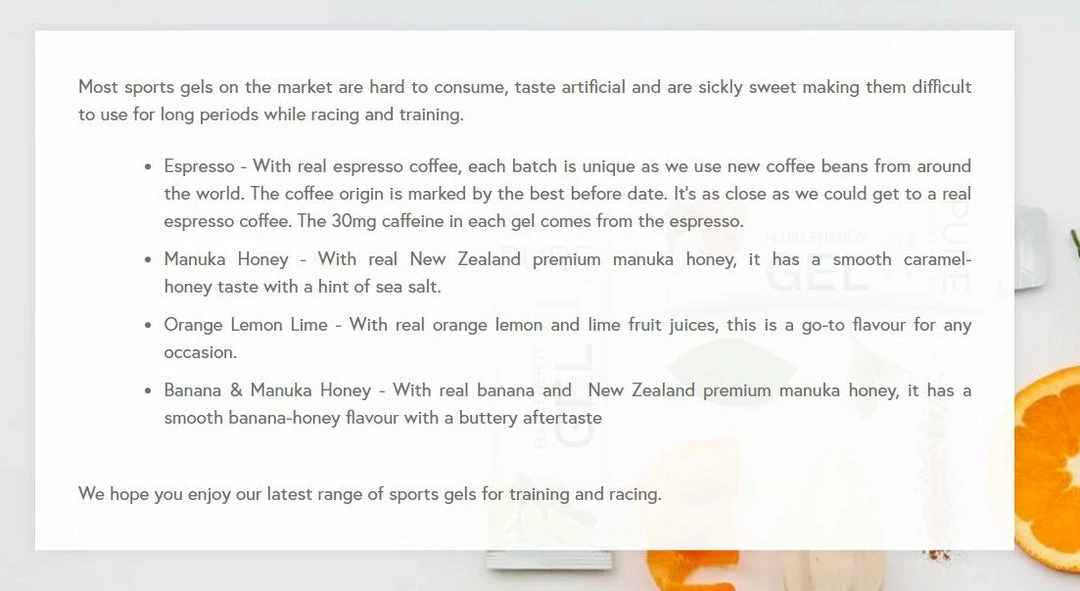 PURE Fluid Energy Gels are flavoured with real fruit and fruit juices. The gel is not sickly sweet and is not thick like normal gels. This makes them easier to consume while exercising and racing.