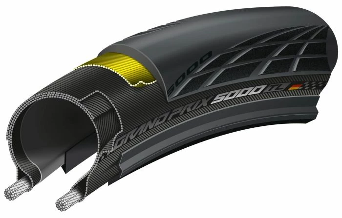 Designed with the legendary Black Chili rubber compound, the Continental Grand Prix 5000 road bike tyre boasts a 10-gram weight reduction in a 25c width, a 12% reduction in rolling resistance and a 20% increase in durability compared with its predecessor. Thanks to the proprietary Laser Grip Technology which creates a micro tread pattern that expands over the shoulder of the tyre, the GP5000 also offers increased all-weather grip, giving you the ability to take even the most technical corners at speed. As a clincher tyre, the Grand Prix 5000 is also incredibly practical and easy to service at roadside too. Lined with the tear-resistant but ultra-lightweight Vectran fibres, the GP5000 sets new standards for puncture protection in road race tyres. So, whether you’re training in a downpour or racing in the sunshine, you’ll have complete confidence that your tyre out-performs the competition in every category and in all possible conditions. Tubeless ready.