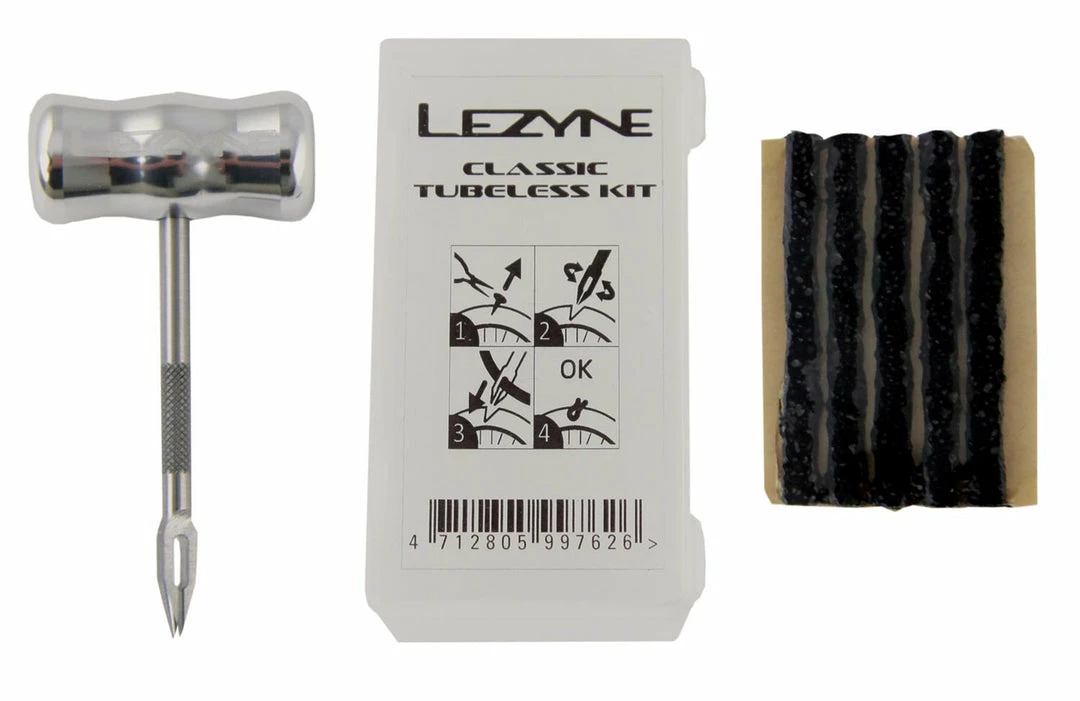 Ultra-compact polypropylene case. Kit includes machined aluminium T-handle with combined reamer and insertion tool and five tire plugs.