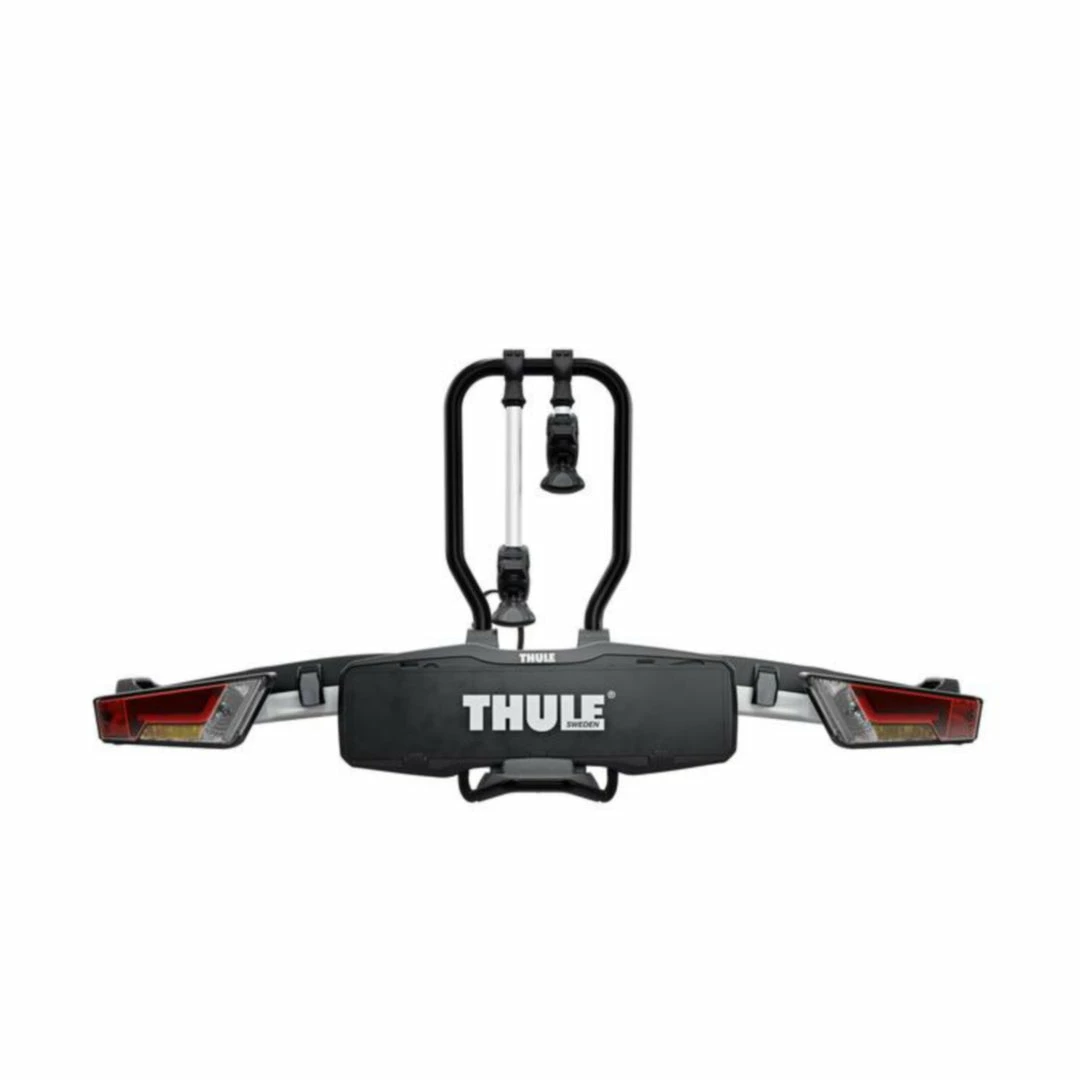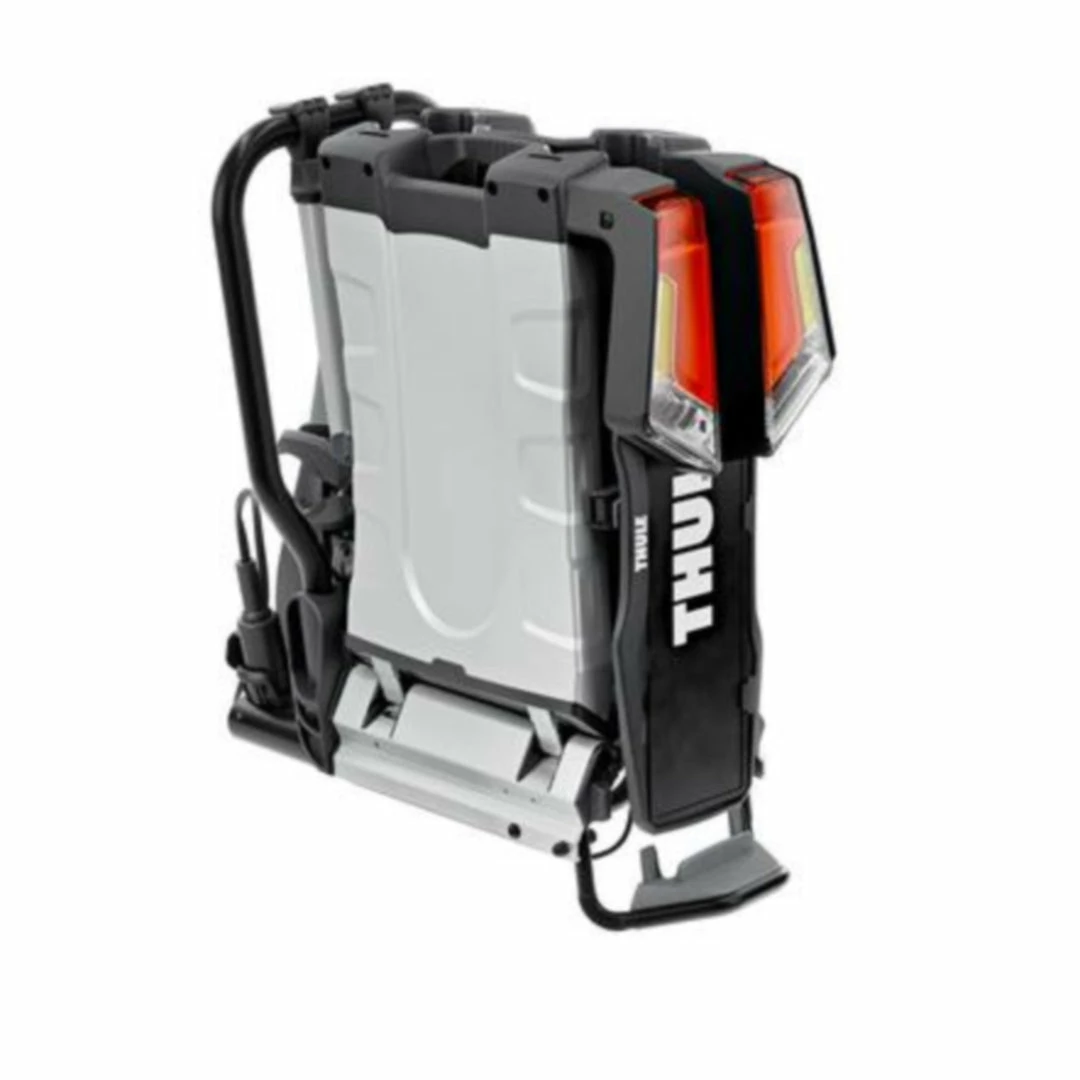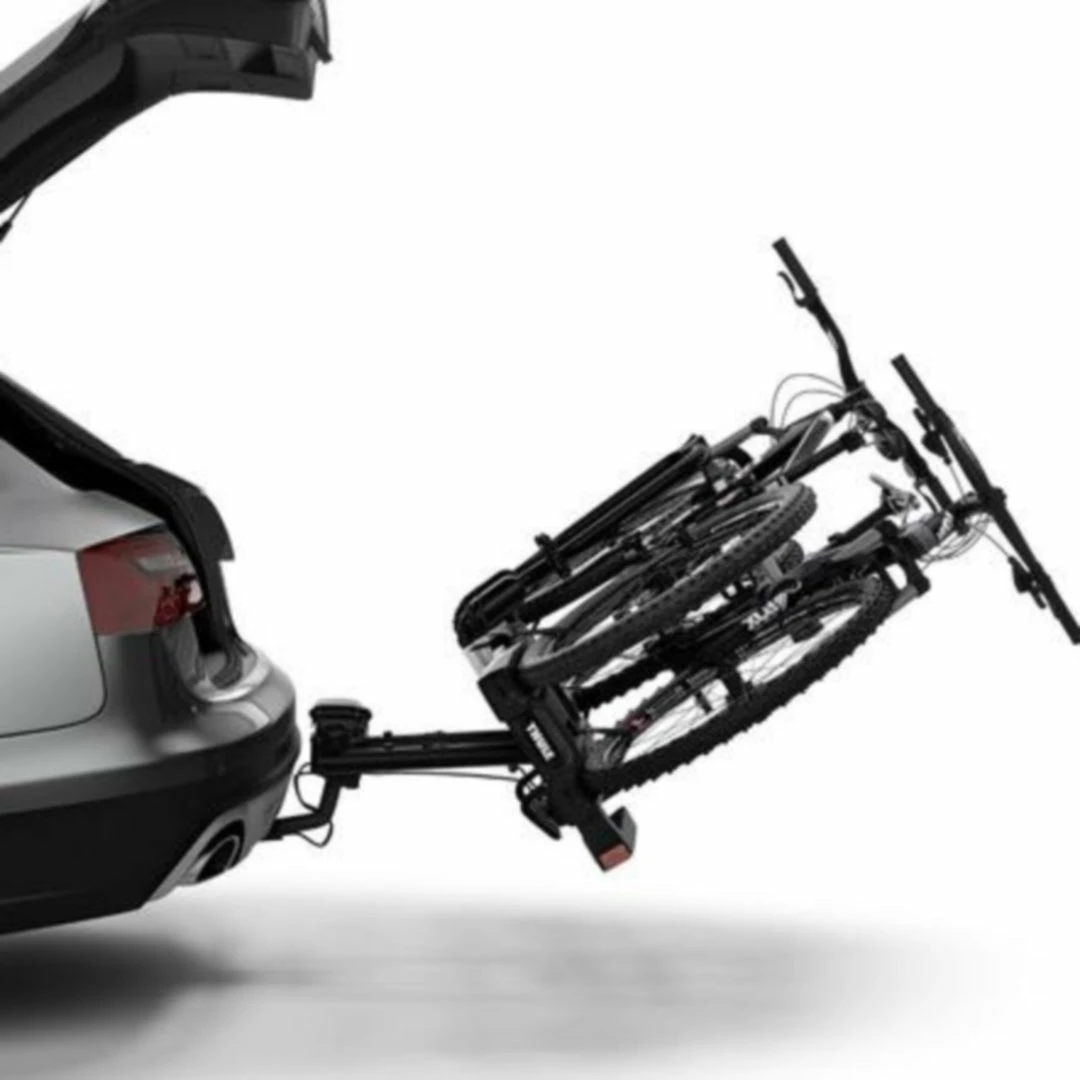 The fully foldable, compact, and easy-to-use towbar-mounted bike rack with a high load capacity enabling transport of e-bikes and heavy mountain bikes. Detachable bike arms with lockable Thule AcuTight torque limiter knobs ‘click’ when optimal torque is reached. The large distance between wheel holders enables transport of sturdy bikes with large wheel bases. Adjustable pump buckles with extra-long wheel straps for easy fastening of wheels (up to 4.7″) for transport of fat bikes. Easy trunk access even with bikes mounted, thanks to smart foot pedal tilt. Wide tilt angle allows opening of even very large rear doors, even with bikes mounted. Easy mounting and adjustment of the bike rack before closing the tightening handle, thanks to the towbar coupling’s initial stability. Ergonomic transport of the bike rack thanks to the integrated carrying handles. Lock your bikes to the bike rack and your bike rack to the towbar (locks included). Fits 50mm ISO compliant towballs only.