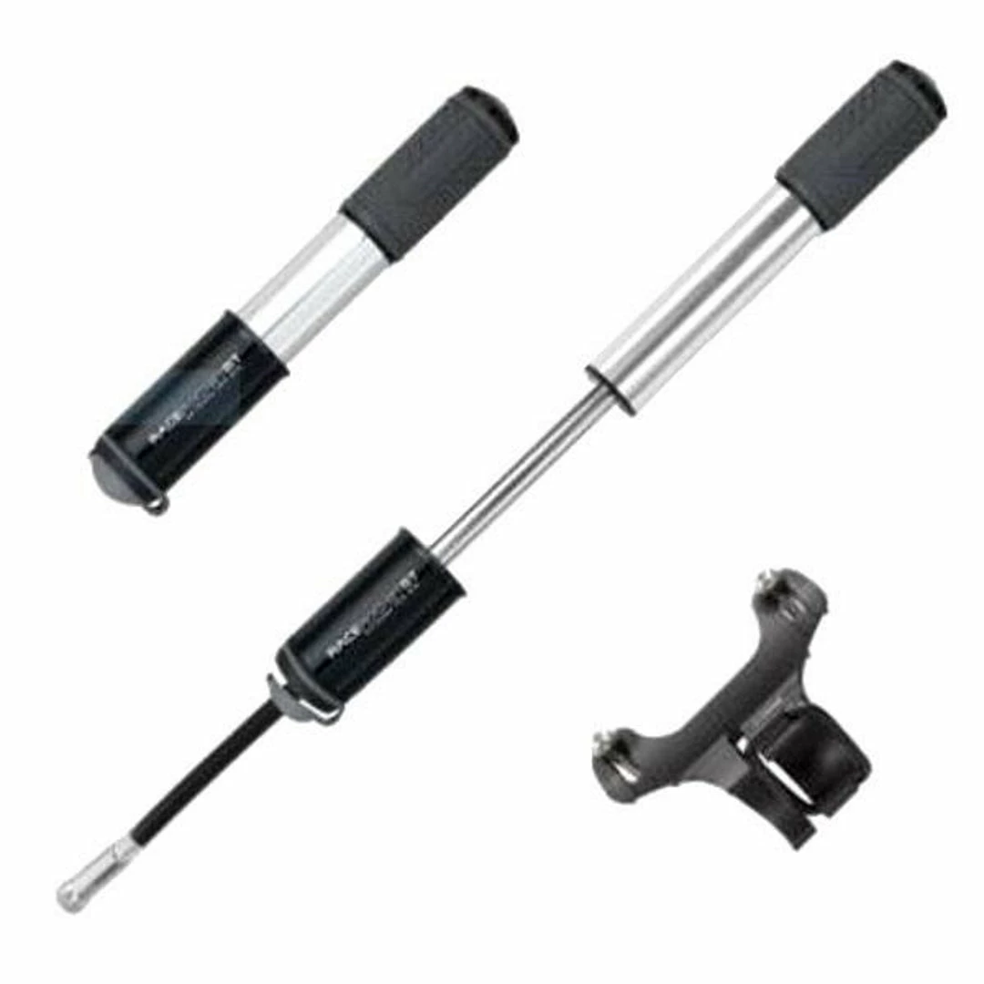 The fattest version in the RaceRocket series, this all aluminium mountain pump gets big volume tires up to pressure fast. This elegant little mini pump features a full aluminium body, head and pump handle and is designed with an increased barrel diameter to push more air per stroke. An extendable hose with SmartHead ThreadLock fills Presta and Schrader valves with ease and helps take stress off the valve stem when filling the tire. Its efficient and smooth action inflates tires to 90 psi / 6 bar. Compact in size it easily fits in a jersey pocket or saddle bag, comes with a side mount bracket and with a low weight of only 114g the RaceRocket MT is never a burden to carry into the backwoods.
